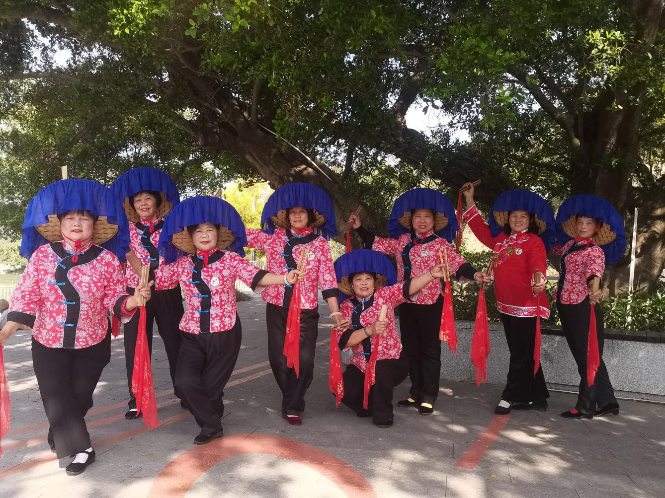 客家嫂山歌队在大榕树下唱山歌。