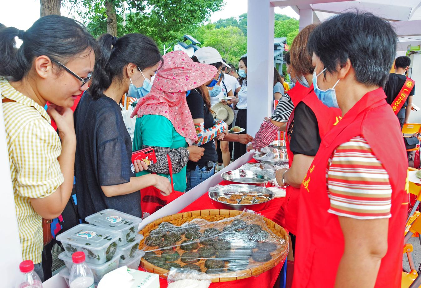 客家嫂志愿服务队志愿者制作糕点在景区义卖。