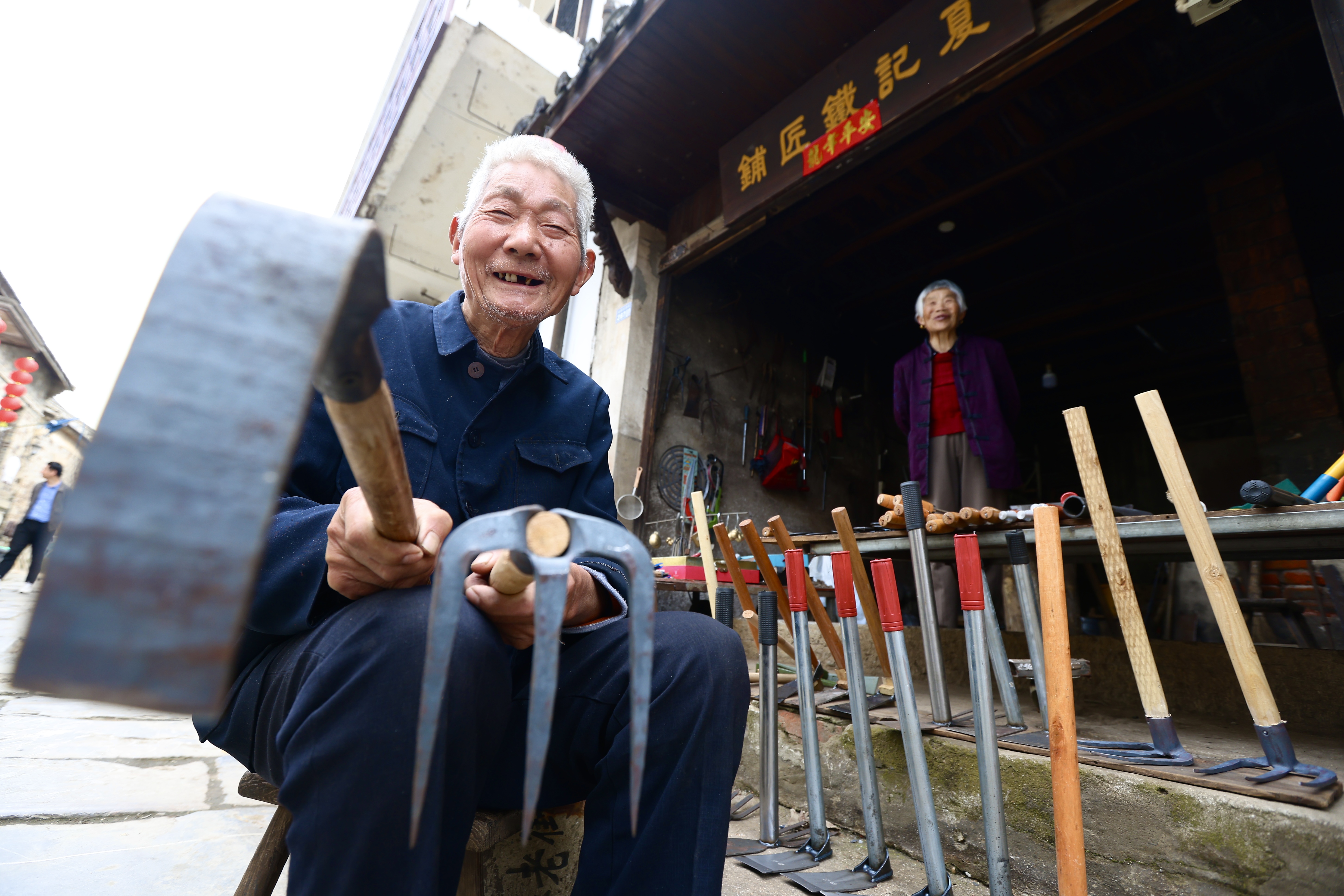 “叮叮当当”的打铁声从老街中段的“夏记铁匠铺”传出,尽管年事已高,85岁的老铁匠夏友庆偶尔还会试一试身手。打铁的手艺在夏家已传了三代,夏友庆16岁时接过店铺,在老街上打铁做活计整整70年。铁匠铺的门口,摆放着锄头、铁镐、铁铲、火钳等夏友庆亲手打制的铁器,吸引游客购买。“买一把小铁锹,在阳台上种花时用得着。”来自南京市区的郑女士说,这样的铁匠铺,她几十年没有看到了。