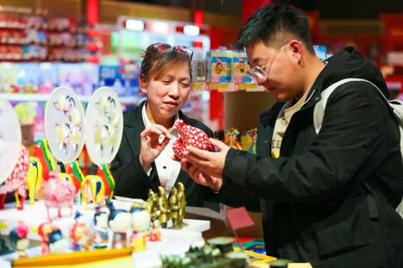 西安站文创店工作人员向旅客介绍文创产品。
