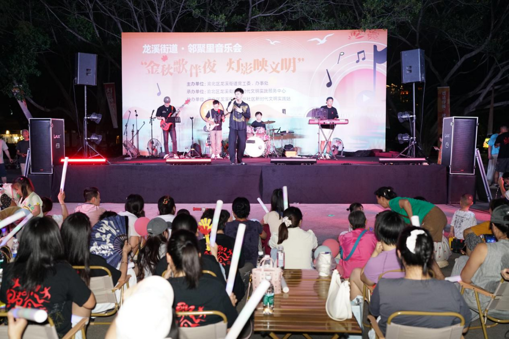 9月4日晚,在渝北区龙溪街道嘉州花园C型房广场上,一场别开生面的“邻聚里音乐会”正在上演:只见居民们挥舞荧光棒,齐声合唱《我和我的祖国》,嘹亮的歌声回荡在广场上空,爱国情怀与邻里情谊在这一刻交融汇聚……这温馨的一幕,正是渝北区“邻里客厅”建设的生动写照。