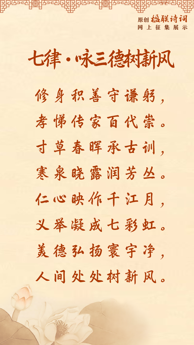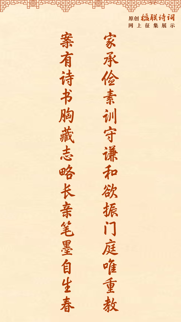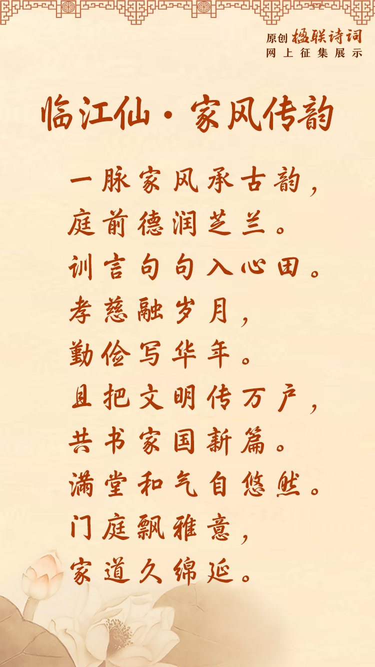 #原創(chuàng)楹聯(lián)詩詞網(wǎng)上征集展示活動# 以詩會友,以聯(lián)傳情!行動起來!共同弘揚(yáng)中華民族傳統(tǒng)家庭美德,共建家庭文明良好風(fēng)尚。