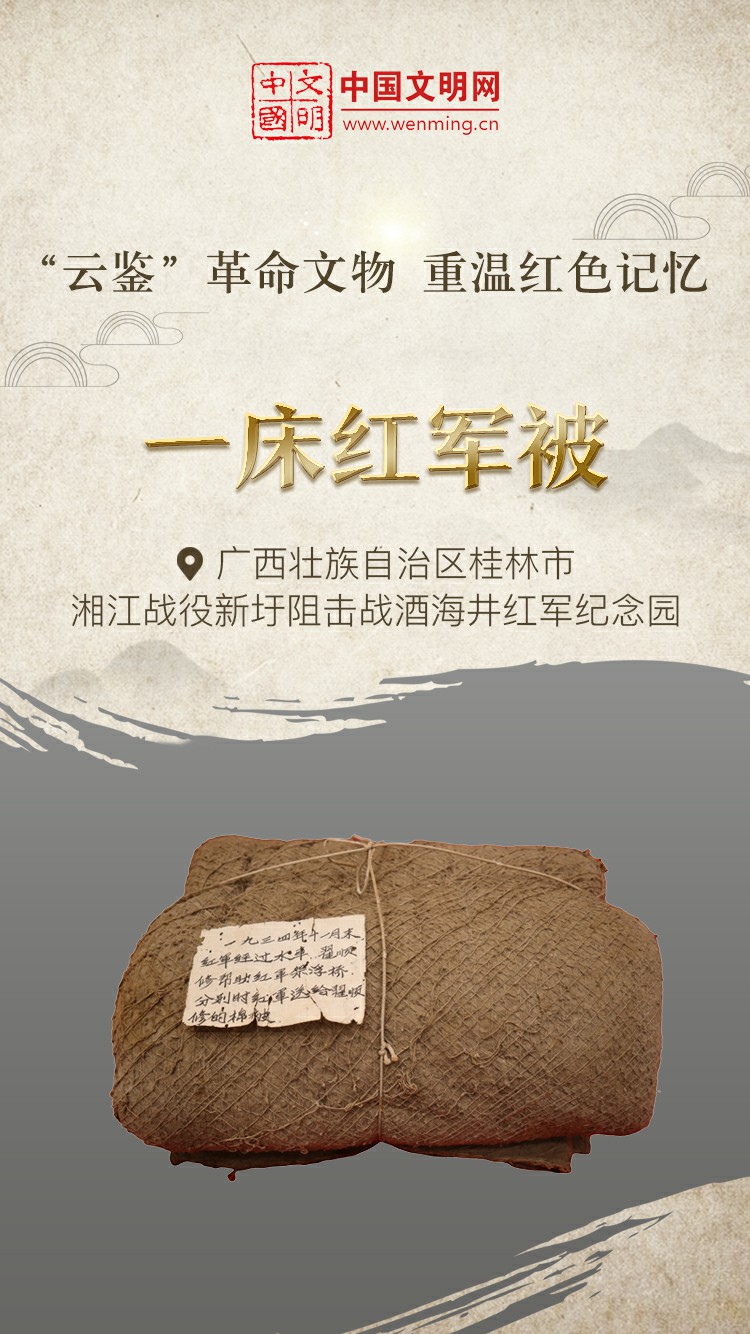 革命文物,承载党和人民英勇奋斗的光荣历史,是弘扬革命传统和革命文化、加强社会主义精神文明建设、激发爱国热情、振奋民族精神的生动教材。中国文明网“文明之声·云鉴馆藏”专栏邀您走进各地革命博物馆、纪念馆、党史馆等红色主题场馆,一起“打卡”红色地标,“云鉴”红色馆藏,汲取奋进力量。今天为您介绍湘江战役新圩阻击战酒海井红军纪念园的馆藏文物——一床红军被。